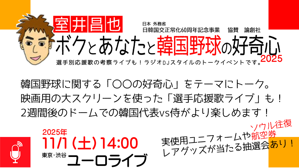 室井昌也 ボクとあなたと韓国野球の好奇心2025 2025年11月1日(土)14時開演 東京・渋谷 ユーロライブ
